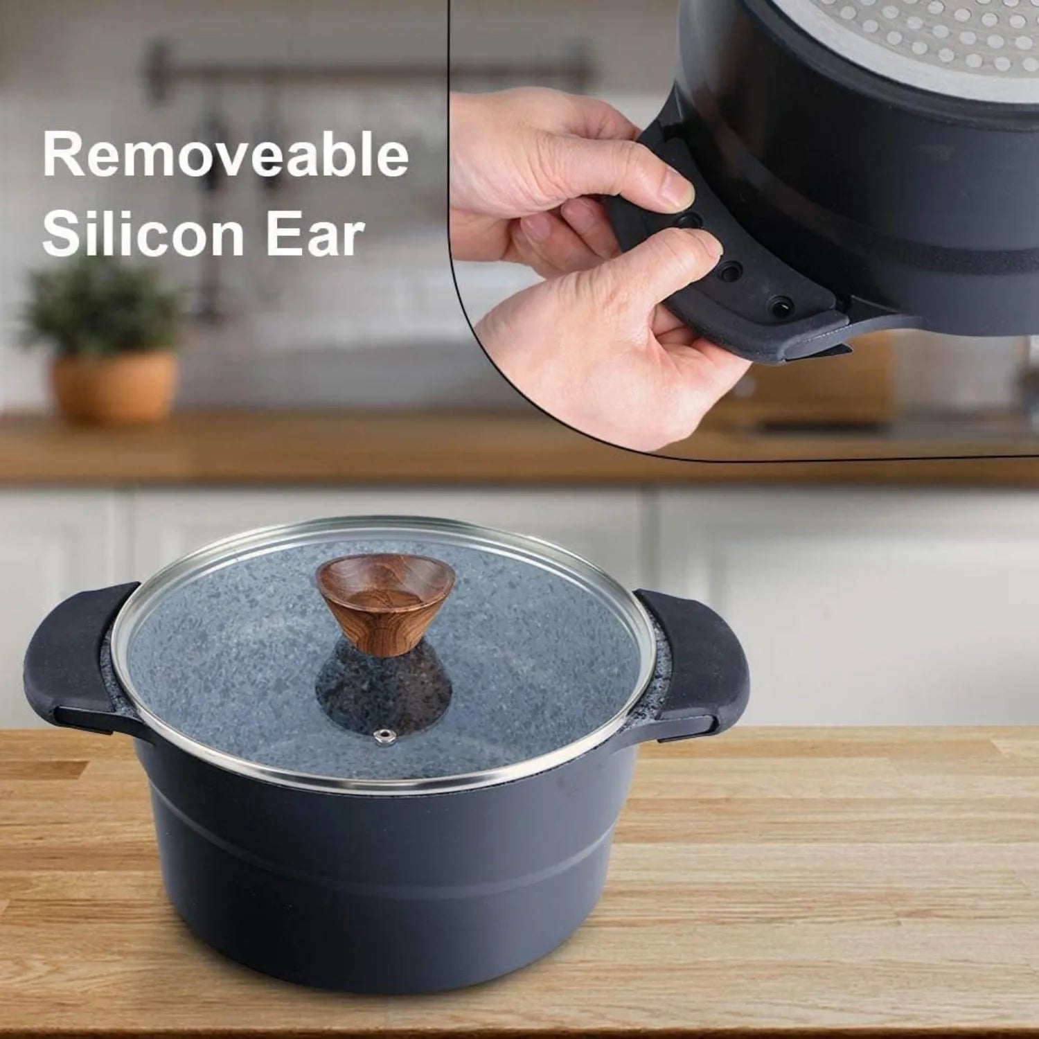 This toxin-free cooking set is meticulously designed to be free from harmful chemicals such as lead, PTFE, and PFOA, ensuring a safe cooking environment for you and your family. The durable Bakelite handles are heat-resistant, providing a safe grip while remaining cool to the touch, even during high-heat cooking.
